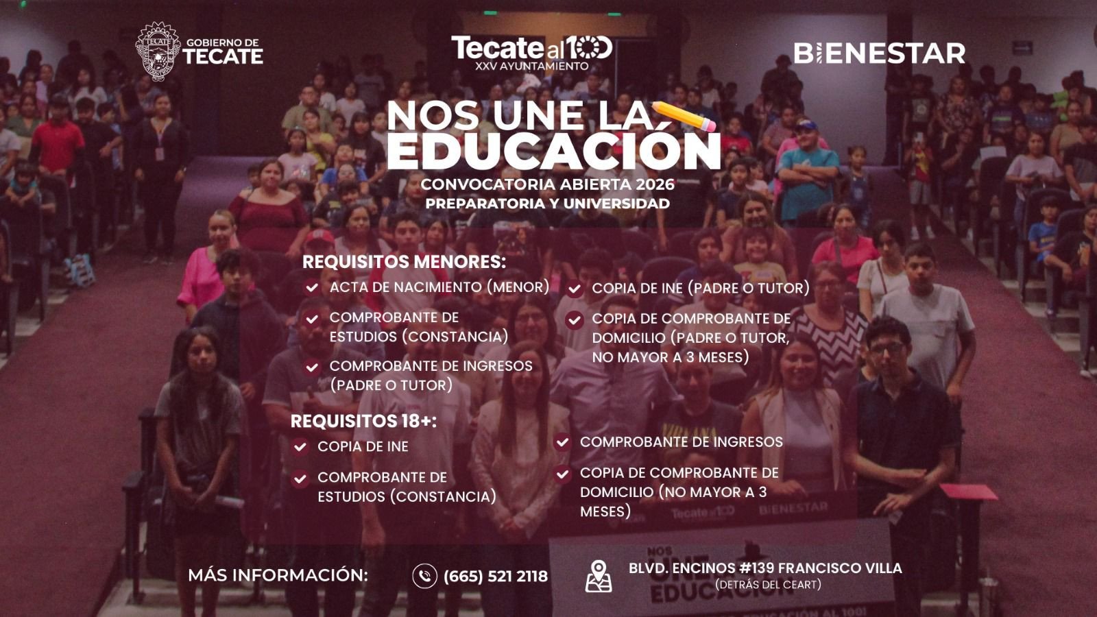 Tecate, Baja California – Reafirmando su compromiso con el impulso a la educación y el bienestar de las familias tecatenses, el Gobierno de Tecate, a través de Bienestar Municipal, invita a la comunidad estudiantil a participar en la convocatoria 2026 del programa de becas “Nos Une la Educación”, dirigido a estudiantes de nivel preparatoria y universidad.
