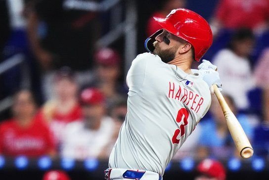 Harper les dio a los Filis una ventaja rápida con un jonrón de dos carreras en la primera entrada. Conectó una recta del abridor dominicano Sandy Alcántara, por encima de la pared del jardín central para su 24º jonrón.