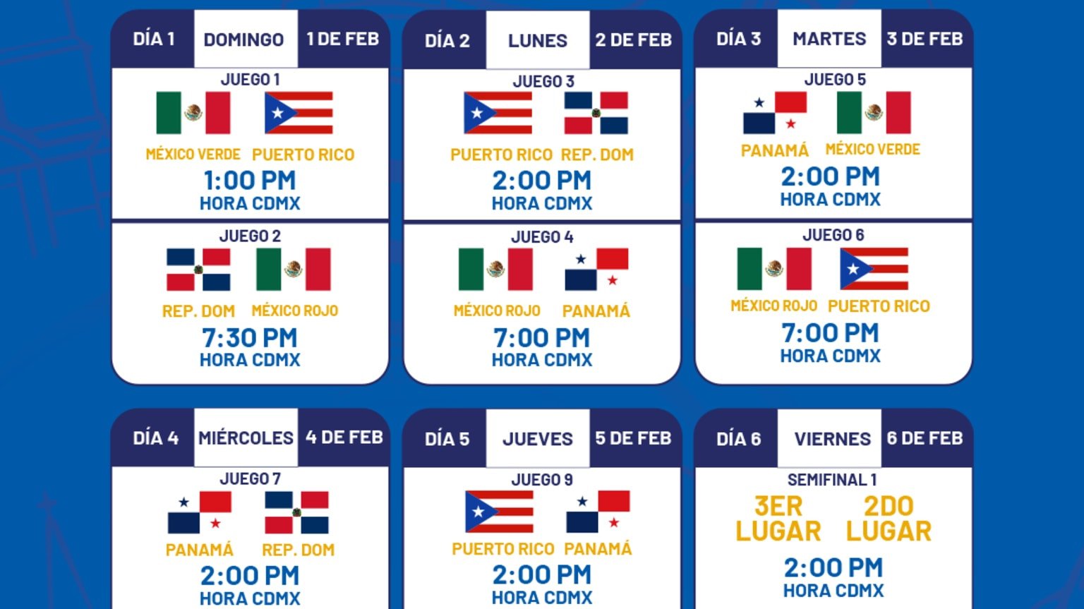 La jornada inaugural se disputará el domingo 1 de febrero. A las 1:00 de la tarde (hora del centro de México), México Verde enfrentará a Puerto Rico, mientras que a las 7:30 de la noche se celebrará el partido entre México Rojo y República Dominicana, precedido por la ceremonia de apertura del certamen. En esta fecha, el equipo de Panamá tendrá jornada de descanso.