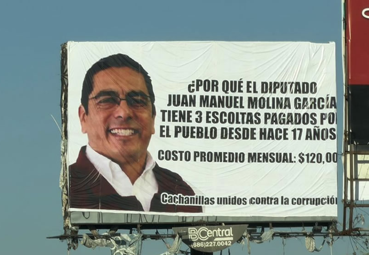 MEXICALI, Baja California.- Un anuncio panorámico colocado sobre la calzada Independencia encendió el debate político luego de que apareciera con la imagen del legislador morenista Juan Manuel Molina y un mensaje en el que se exige retirarle el servicio de escoltas que —según el señalamiento— ha mantenido durante 17 años con cargo al erario. El mensaje está firmado por el colectivo Cachanillas Unidos contra la Corrupción, que asegura que el costo mensual de esa protección asciende a 120 mil pesos.