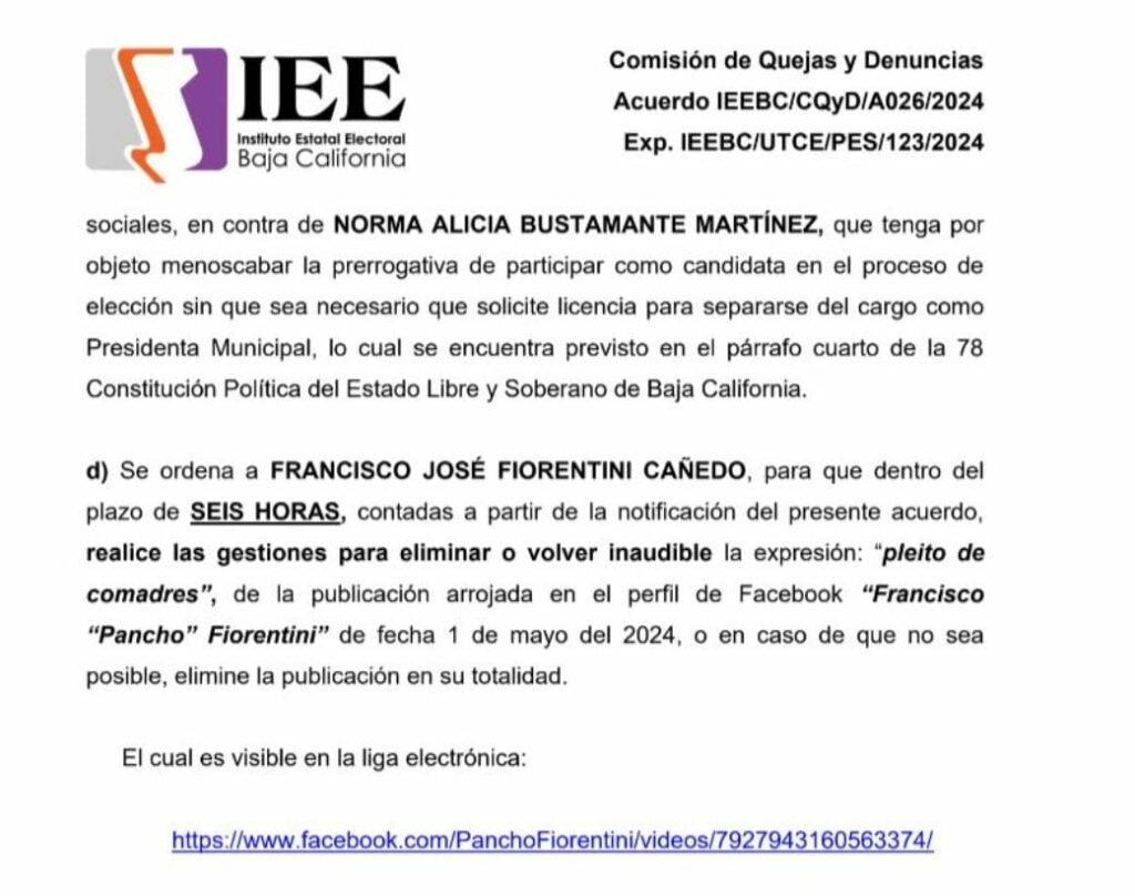 De igual forma se establece un plazo de 6 horas una vez notificado para que se elimine o se vuelva inaudible la expresión pleito de comadres de la publicación realizada en el perfil de Facebook Francisco Pacho fiorentini del primero de mayo del 2024.