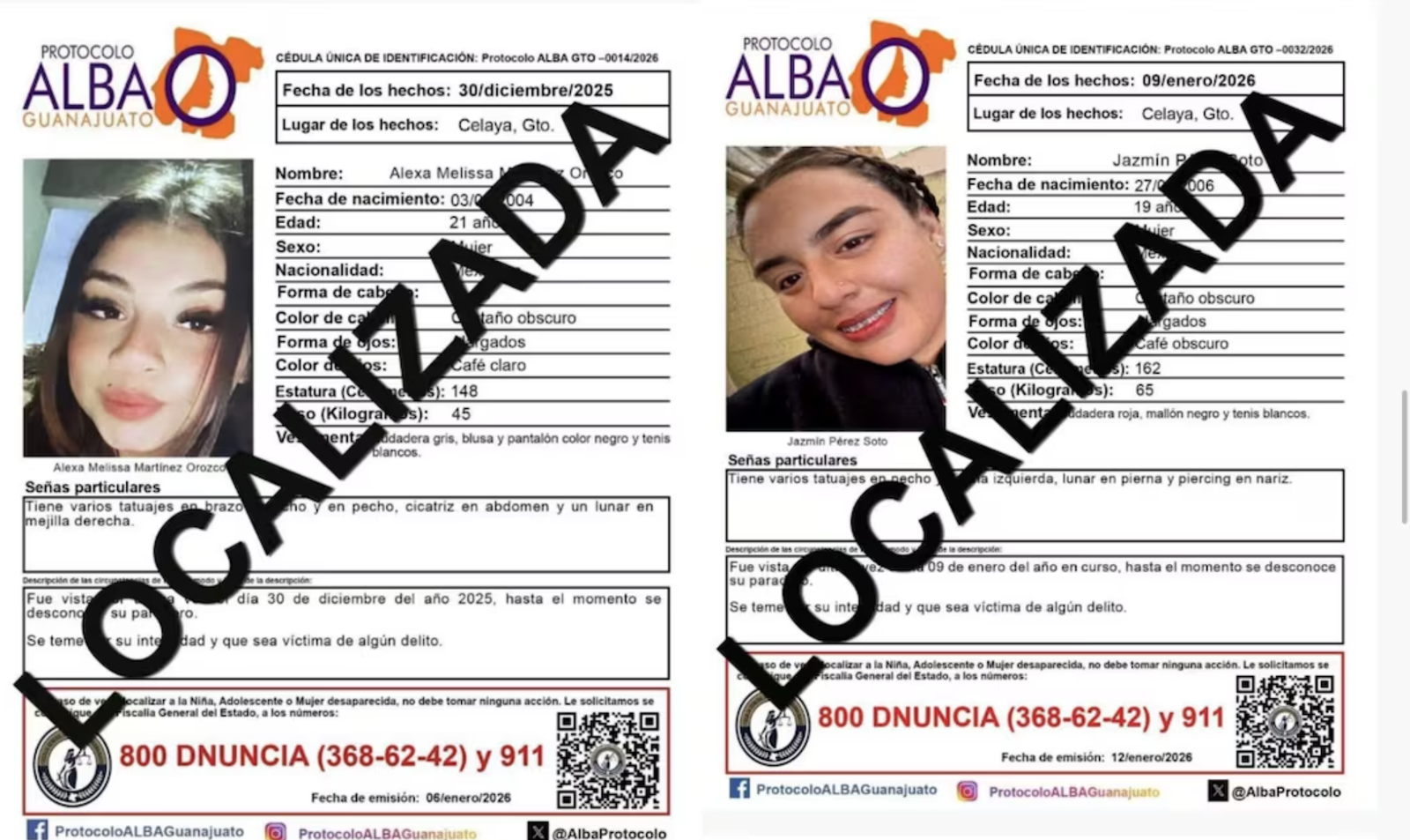 Las cinco mujeres, de entre 19 y 30 años de edad, contaban con reportes activos en la Alerta Amber y el Protocolo Alba. Fueron identificadas como Mónica, de 19 años, desaparecida el 26 de febrero de 2025; Melani Berenice, de 21 años, el 18 de marzo de 2025; Alondra Rubí, de 30 años, el 12 de mayo de 2025; Alexa Melissa, de 21 años, el 30 de diciembre de 2025; y Jazmín Soto, de 19 años, buscada desde el 9 de enero de 2026.