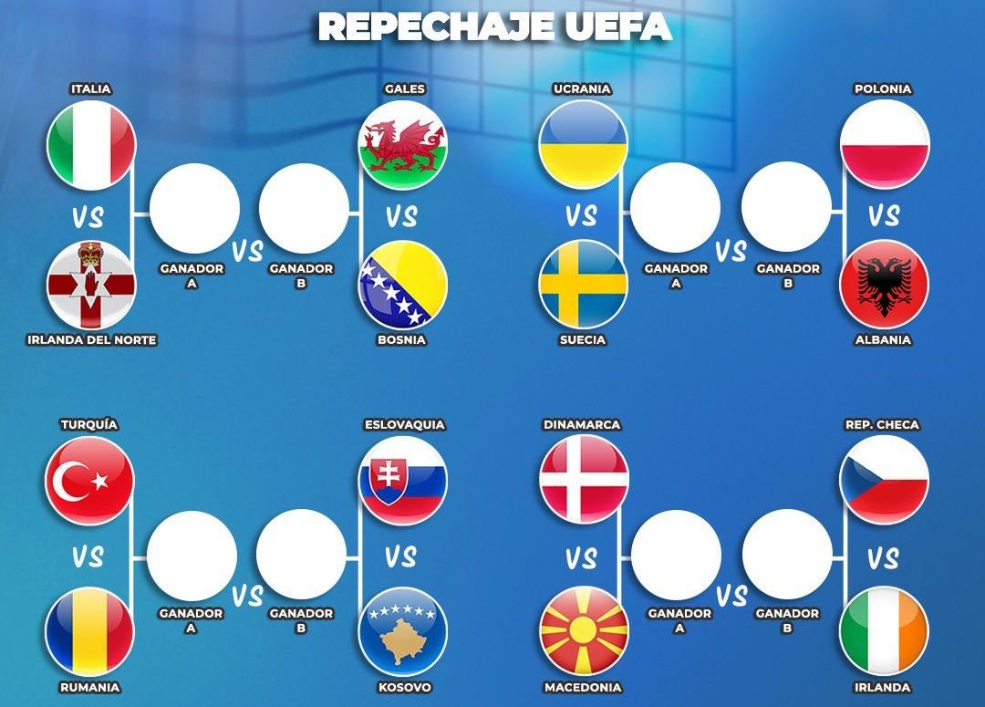 Son 22 selecciones que jugarán por los últimos seis boletos para la Copa del Mundo 2026. Por un lado, está el repechaje de la UEFA que disputan 16 conjuntos y que da cuatro lugares, mientras que por otro se encuentra el torneo clasificatorio con combinados de Conmebol, Concacaf (2), AFC, CAF y OFC, que repartirá dos plazas.