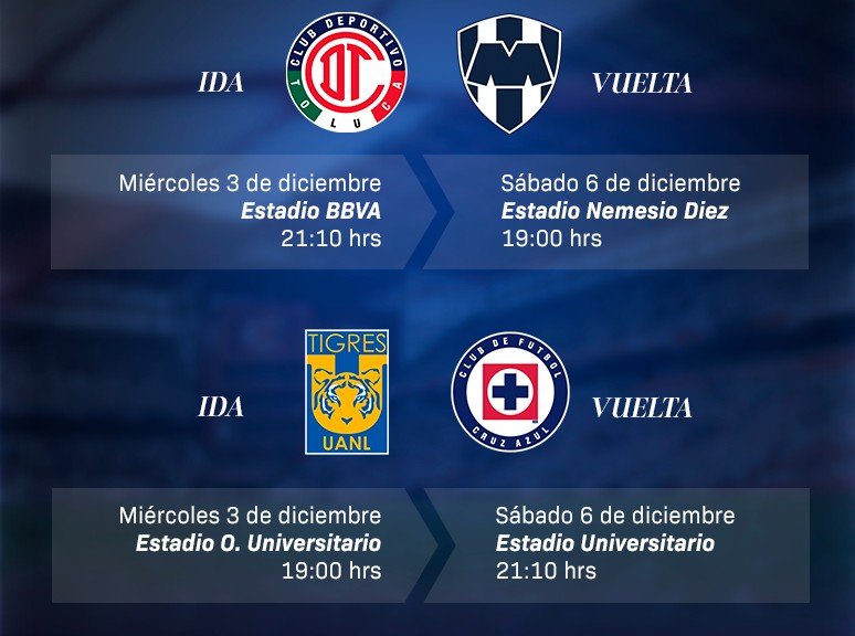 CIUDAD DE MEXICO.- Toluca y Rayados definirán uno de los boletos para disputar el trofeo del futbol mexicano, mientras que el otro aspirante se decide entre Tigres y Cruz Azul en juegos que se van a celebrar en la ida el miércoles y la vuelta el sábado.